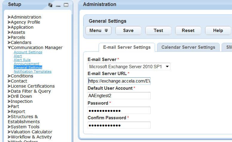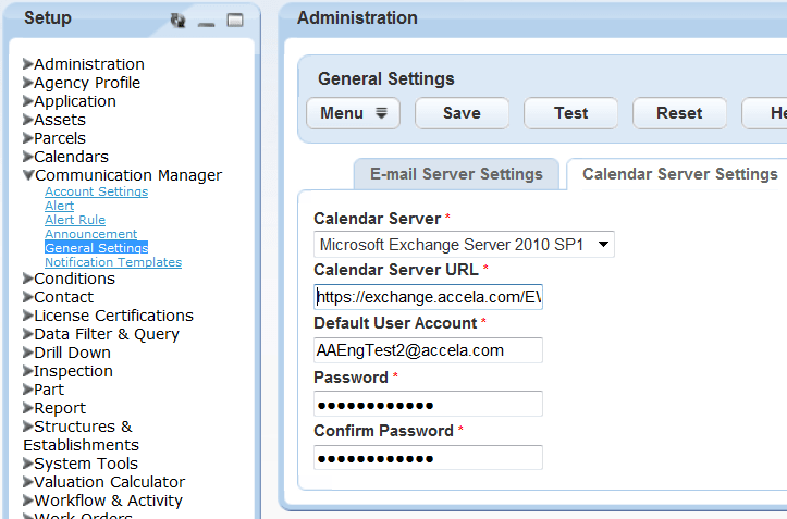 Calendar Server Select the Microsoft Exchange Server version your agency uses. Calendar Server URL Enter the URL to your Calendar Server. Default User Account Enter the user name of an active email account on your Microsoft Exchange Server to designate it as the default email account Civic Platform uses for sending meeting requests. When Communication Manager sends system-level emails, it uses this default email account as the “sent from” address.