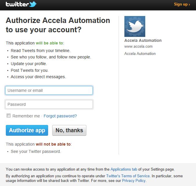 Enter your Twitter account credentials, and then click Authorize app.