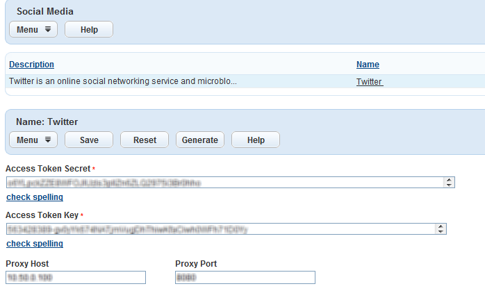Access Token Secret The access token secret that displays in the Access Token Generator page. Access Token Key The access token key that displays in the Access Token Generator page. Proxy Host Optional. The host address of the proxy server that you plan to use for posting tweets. Proxy Port Optional. The port of the proxy server that you plan to use for posting tweets. -