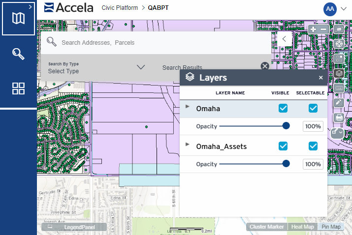 The GIS administrator configures the map service permissions and the initial settings of the VISIBLE and SELECTABLE attributes for the Default or any named GIS user group. For details about granting permissions to map layers, see Configuring Accela GIS > Product Integrations > User Groups > Map Layer Settings in Accela GIS Administrator Guide.
