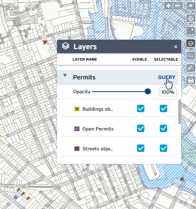queries for the Buildings objects, Open Permits, and Street objects map layers: