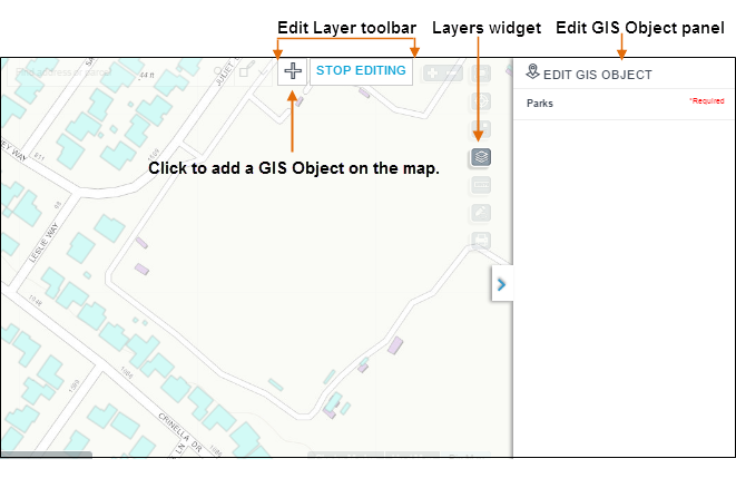 The edit layer session disables the Search box, selection tool, zoom control, and the other map widgets. The edit layer session also resets the GIS Objects panel. After you stop an edit layer session, the GIS Objects panel shows only the new or updated GIS object(s) on the map layer that was just edited. This GIS Objects panel (that is displayed after an edit layer session ends) does not show GIS objects that were previously selected before you started the edit layer session.