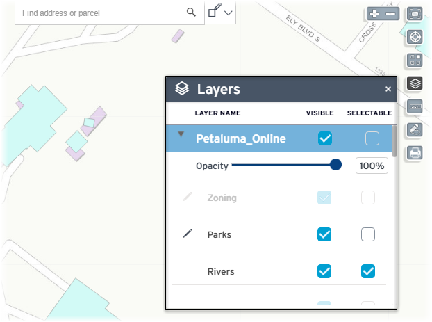 If the VISIBLE option is unselected or a map layer is not visible at the current zoom level, the SELECTABLE option is disabled.