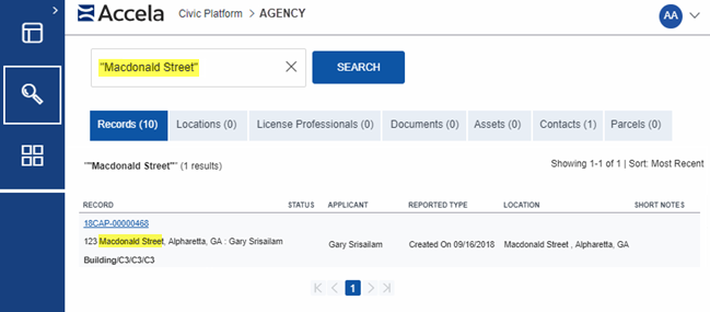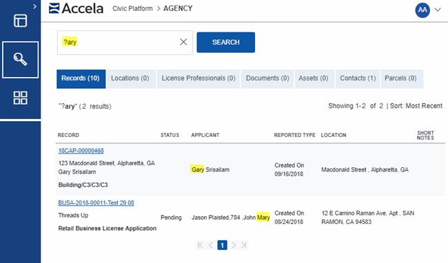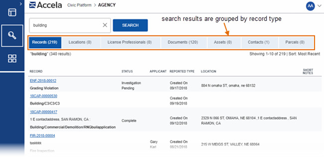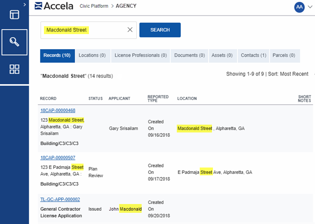 Global Search allows you to find records quickly by entering a simple search criteria on the search box. The global search results list includes the Record (ID and record type), Status, Applicant, Reported Type, Location, and Short Notes columns. This version of Civic Platform includes search functionality upgrades that make finding things inside Civic Platform a more intuitive process. The new search features are built on the Elasticsearch (or Elastic Search) engine with wildcard and string search operators, providing more intuitive and robust full-text searches.